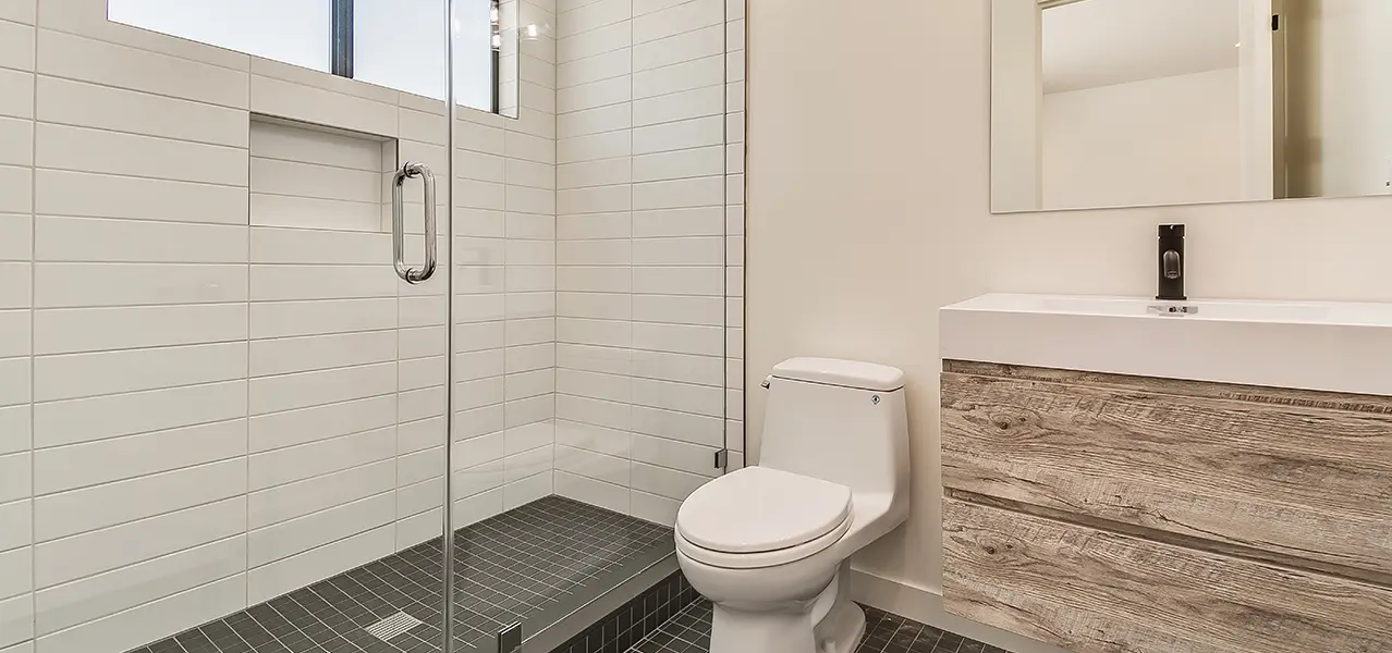 A third bathroom embraces a clean, bright aesthetic with white horizontally laid rectangular tiles in the shower. The floor features dark grey herringbone tiles, which extend from the shower into the rest of the room. A large freestanding tub is positioned under a wide window. The double vanity features a light wood floating base with a dark countertop and a large mirror, illuminated by modern sconces.