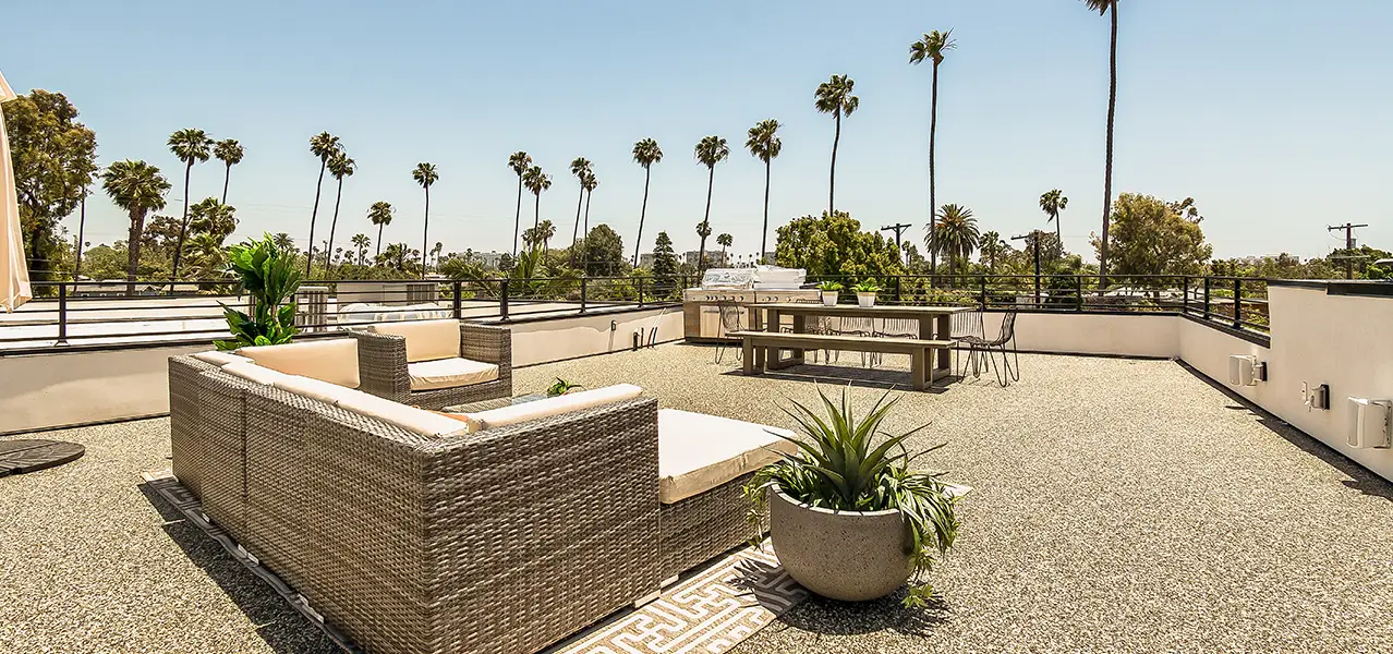 The renovation extends its luxurious living spaces to the outdoors, most notably with an expansive rooftop deck. This versatile outdoor area is designed for entertaining and relaxation, featuring comfortable outdoor lounge furniture and a dining set, along with a built-in barbecue area. Surrounded by low walls and black railings, the deck offers panoramic views of the surrounding landscape, punctuated by numerous palm trees, creating a quintessential California outdoor experience.