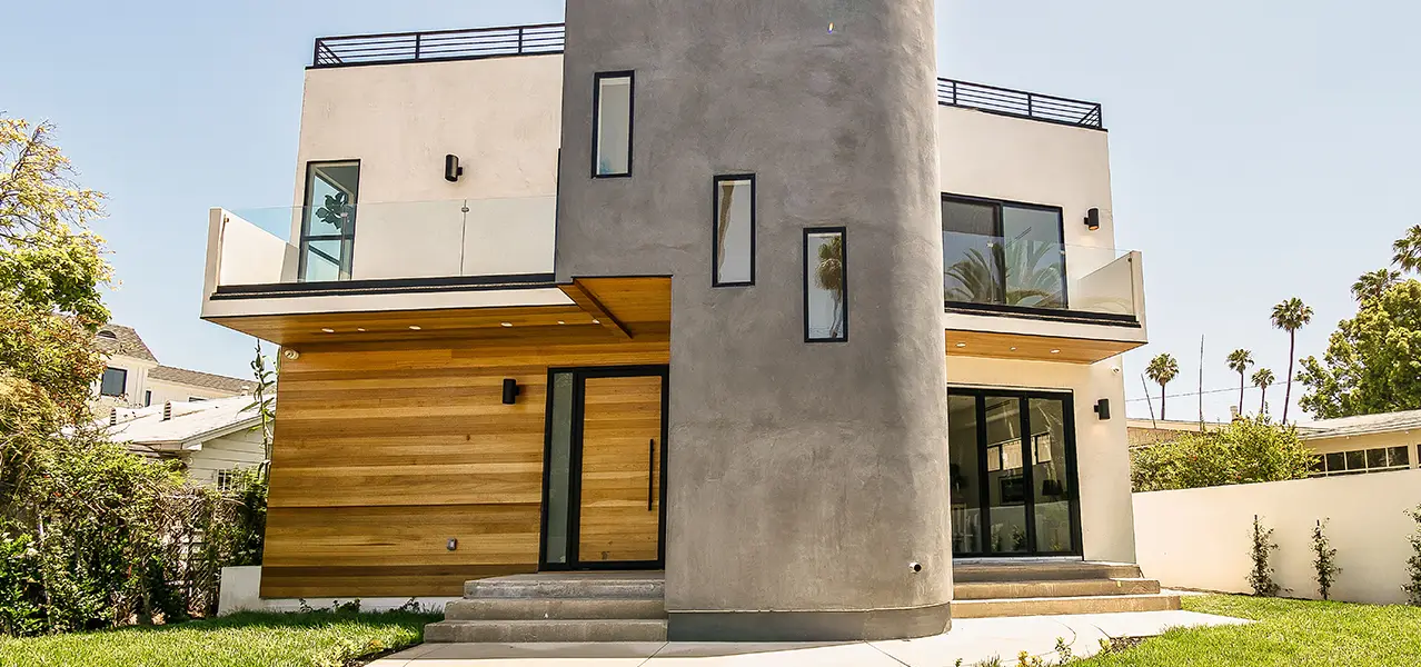 The exterior of the renovated home makes a definitive modern statement. It features a striking multi-level design combining clean white stucco with a prominent cylindrical concrete element that adds a sculptural, contemporary touch. Warm-toned horizontal wood siding introduces an organic counterpoint to the cooler concrete and white finishes, creating an inviting facade. Large windows and glass balcony railings enhance the home’s transparency and connection to its surroundings, while a flat roof with black railings suggests an accessible outdoor space. The modern front entrance with its solid wood door and vertical glass panels reflects the interior’s contemporary aesthetic.