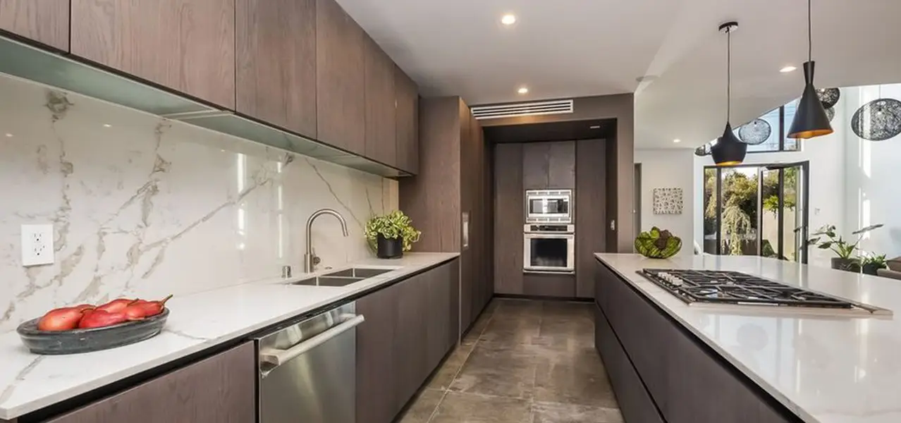 The kitchen is a testament to modern design and integrated functionality, characterized by its sleek lines and rich material palette. It features extensive dark-toned, possibly wood or laminate, flat-panel cabinetry, providing ample, discreet storage that maintains the kitchen’s streamlined appearance.