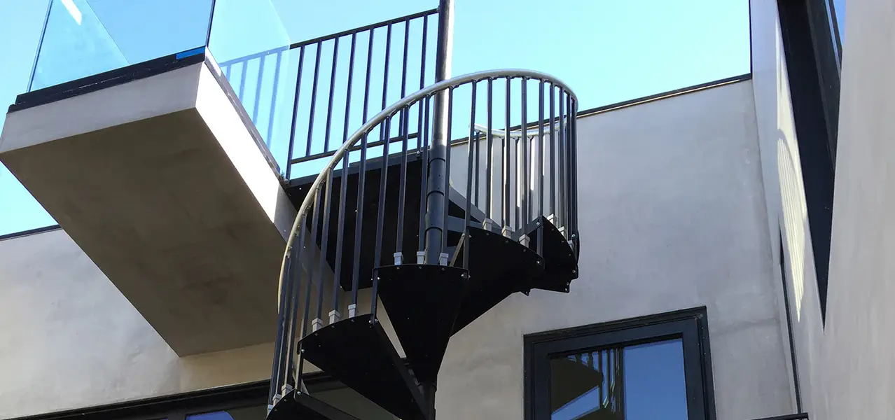 A defining feature of the renovation is the captivating staircase, which serves as both a functional connector and a dynamic piece of art. It features light-toned wooden treads that appear to float, cantilevered from a robust dark metal stringer. This open design allows light to pass through, emphasizing its lightness and sculptural form, while also providing glimpses into other areas of the home. An impressive black spiral staircase on the exterior provides an alternative, equally dramatic access point between levels and outdoor spaces.